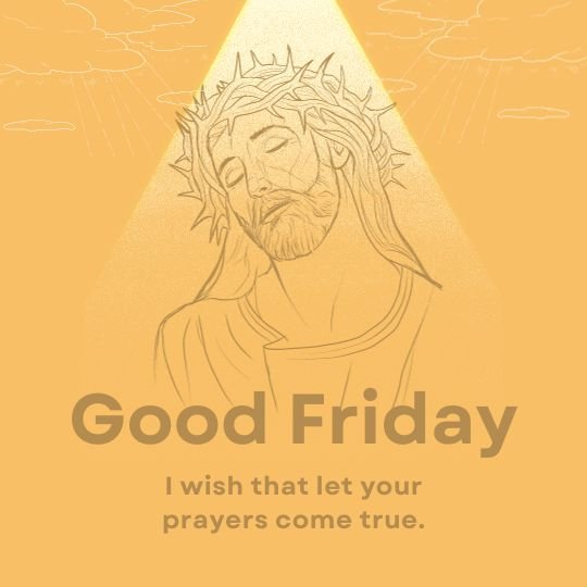 Share the spirit of Good Friday with this evocative illustration of Jesus wearing a crown of thorns, set against a yellow backdrop with a message of hope and peace.